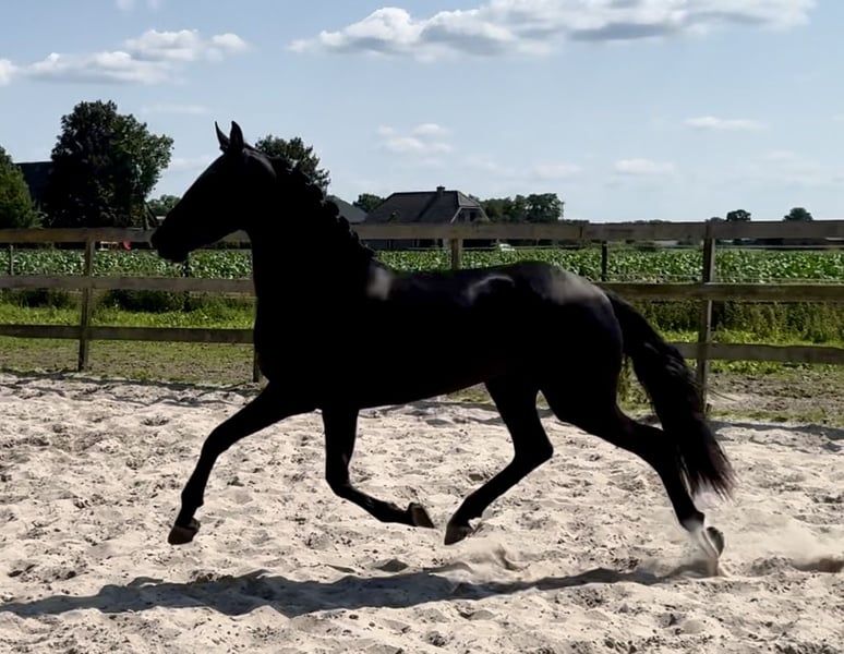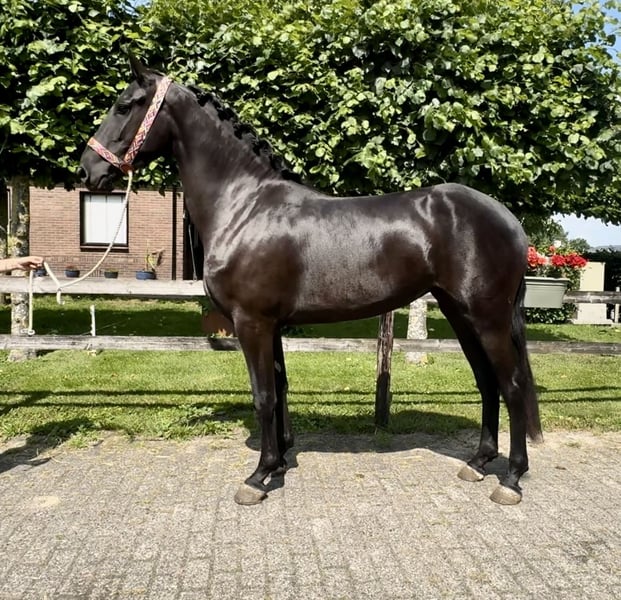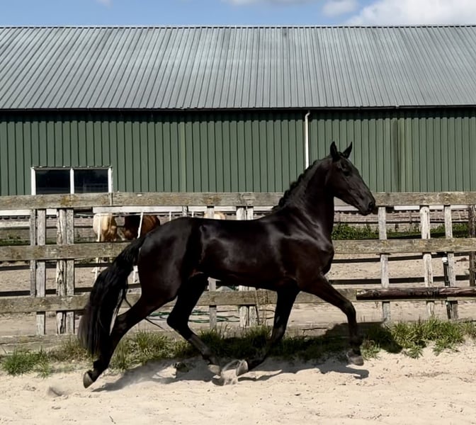 Hele gave 4 jarige PRE X Friese 4 jarige gitzwarte merrie ze is 160 groot met veel body en zal zeker nog wat groeien. Libby kan extra bewegen en heeft 3 hele goede gangen. Ze is op wat longeren na nog groen en nog helemaal onbeleerd. ze is in het bezit van een paspoort.