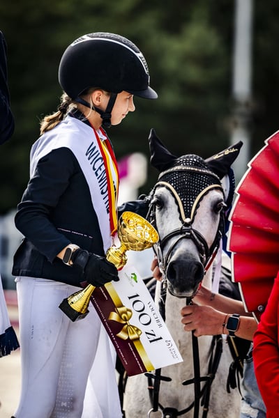 Zum Verkauf steht ein wunderschöner Ponny mit außergewöhnlicher Erscheinung und ausgezeichnendem Charakter, vor allem aber mit großem Herz für den Sport: Seryl ist aktueller Hallenmeister von Warschau und Masowien 2025 sowie Vizemeister von Warschau und Masowien 2025. Zudem ist er Vizemeister von Warschau in der offenen Saison 2024. Dieser außergewöhnliche Ponny hat erfolgreich an den Polnischen Pokalen 2024 und 2025 teilgenommen und startet regelmäßig bei nationalen DiM-Wettbewerben. Er ist stets zuverlässig zur Stelle. Sehr springfreudig, regelmäßig auf 80 cm im Turnier, zuhause sogar bis 90 cm hoch gesprungen. Seryl ist ein ruhiger und freundlicher Ponny. Einfach im Umgang, problemlos beim Putzen, Beschlagen und Transport. Regelmäßig geimpft, entwurmt, in Betreuung eines Physiotherapeuten und eines Hufschmieds, unfallfrei. Er geht mit anderen Pferden auf die Weide. Verkauf aufgrund des Wachstums der Turnierreiterin. Nur in liebevolle, gute Hände!!! Probefahrten möglich. Besichtigung in Podłęcze bei Góra Kalwaria (Mazowieckie). Videos und weitere Informationen unter Tel.: 604528324 Instagram: wiktoria_skobel