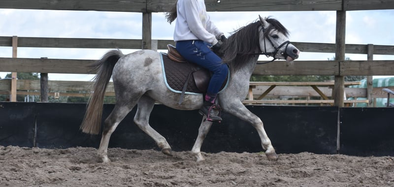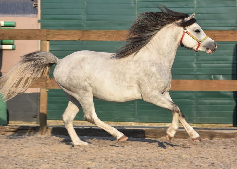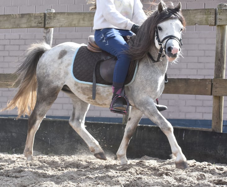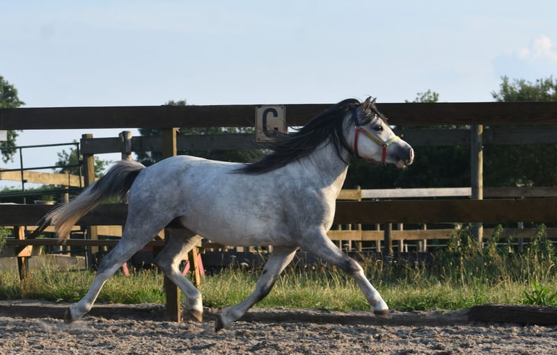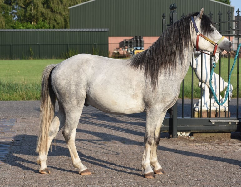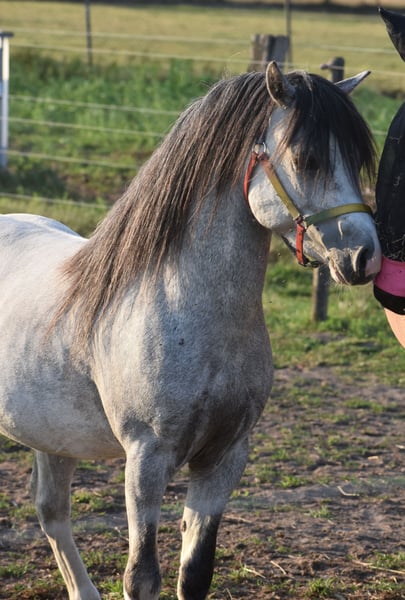 Cuppers Winston is the name of this nearly 4-year-old beauty! His call name is Blue Boy. He also has a stunning, blue roan coat. He boasts an impressive pedigree: Click here for his papers: Eindegooi’s Pretty Charmer x # Oldenzijlster Action Man x # Vechtzicht’s Cymro Bach. He has a gorgeous, full yet elegant build. A head straight out of a Disney movie. And his movement is spectacular! A lot of groundwork has already been done with Blue Boy, and he has been very well-behaved in handling, in the trailer, in the stable, and in the pasture, both now and previously. Winston is currently a gelding, but as a stallion he was already very well-behaved. He is now growing taller and is a large B size. He is an incredibly cooperative and super sweet gelding. He enjoys riding and is eager to continue growing: for recreational riding, he is perfectly behaved here, but he is also very suitable as a sport pony. We expect him to be very easy to train for carriage driving – what a stunning picture that will be! He loves riding and has been well-behaved from the very beginning; we could mount him immediately without any issues right from the start. Price: €4,750 – including branded saddle and pad.