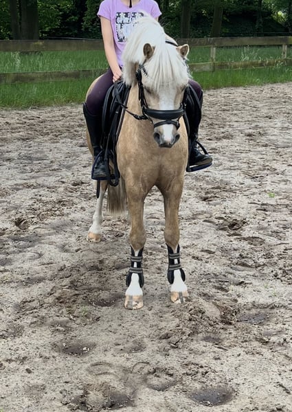 🌟 Eye-Catcher for Sale – Beautiful Palomino Pony with Lots of Presence! 🌟 Welsh Pony – Gelding – 5 years old – A Pony – 116.5 cm – Radiographically & clinically approved Are you looking for a reliable children's pony that is also a true eye-catcher? This stunning Palomino with four tall white legs and a broad blaze is a real gem and has an excellent, honest temperament. Purchased from the breeder and fully healthy: radiographically and clinically approved. Pedigree: Cwmhendy Buster X Blaenau Dion X Friars Superman* Sire approved stallion: Penpadrig Brynmor* (see last photo) 💛 Character & Temperament • Very sweet and calm, ideal for beginner riders. • Loves attention: hours of cuddling and grooming. • Very people-oriented and friendly. • Calm at the farrier, vet, clipping, and washing. • Strong hooves. • No stable vices. • Well-behaved on the lead – can be easily loaded onto a trailer by a small child. 🐴 Training & Experience • 5 years old and saddle-trained. • Attends pony club lessons weekly. • Has participated in a Bixie competition and a small club event (rider had no interest in more competitions). • Easy to ride and cooperative. • Gentle in the mouth, easily accepts the contact. • Suitable for both sport and beginner/young riders. • Learns quickly and enjoys participating. 🌿 Traffic & Environment • Traffic-proof. • Calm on outdoor rides. • Has been to the neighborhood’s St. Martin’s fire event. • Adapts easily to new situations. 🩺 Health & Care • Always vaccinated and dewormed on schedule. • Recently had a dental check. • Correct conformation and strong hooves. ✨ A true eye-catcher with a golden character: sweet, honest, and ready for both beginner riders and sport. 📍 Located in the Netherlands (Meijel) 📞 For more information, please contact us at: +31 6 24332911