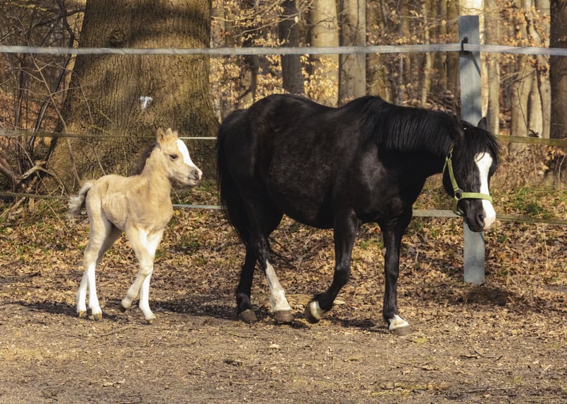 Beautiful black mare Welsh A with foal at foot