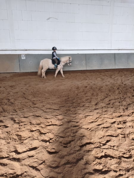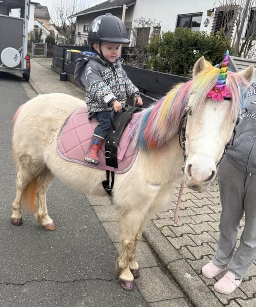 Since our children unfortunately no longer show the expected interest, we are offering our sweet little pony for sale. She is approximately 7 years old and has an excellent temperament with children. She happily tolerates all kinds of mischief, whether it's visits to the kindergarten or rides out into the countryside. She is very rideable, even if the kids need to assert themselves a bit — typical pony behavior. Unfortunately, she is underchallenged with us and has developed a pacing gait as a result. When worked regularly and properly, this gait disappears completely. It is purely a muscular issue, confirmed by veterinarian and osteopath. She has competition experience and has been quite successful up to novice level dressage. She is definitely a young pony with potential and beautiful movement. I can also imagine her being suitable for therapeutic riding and driving.