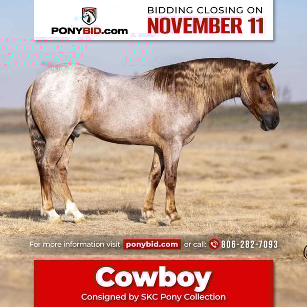 𝓽𝓱𝓮 𝐑𝐈𝐃𝐄𝐑'𝐒 𝓒𝓱𝓸𝓲𝓬𝓮 🐴 𝐏𝐎𝐍𝐘 𝐄𝐃𝐈𝐓𝐈𝐎𝐍 🐴 Happening now thru TUESDAY | NOVEMBER 11th - Available EXCLUSIVELY on Ponybid's website! For more details and to register visit: www.Ponybid.com CONSIGNOR CONTACT: SKC Pony Collection 806-282-7093 LOCATION: Canyon, TX BREED: Welssh-Cobb Pony REGISTERED: No COLOR: Red Roan HEIGHT: 12.2 AGE: 10 GENDER: Gelding Cowboy is an adorable Welsh Cobb that has a heart of gold and a kind, pleasing personality. At the handy size at 12.2 hands tall and a perfect age of 9 years old, this pony is incredibly broke with a light, easy direct rein or a simple neck rein he will go anywhere you ask. He has a smooth jog or can long trot to keep right up with the big horses. He canters slow and easy and packs a big stop. He is not a forward kind of pony, he has more rate and is laid back. Cowboy is comfortable around lots of dogs, pigs, goats and wildlife. He’s very used to semis and heavy machinery. Cowboy is not easily rattled and has spent a lot of time at the feed yard riding pens and shipping cattle. He has been used just like a big horse. Cowboy is a great pony for a child to learn to rope on. He is content to stand at the dummy and let the kids rope it for hours or track the sled around the arena or track some big slow cattle around. There’s no nonsense at all with Cowboy. He has been to play days and junior rodeos to do everything from the lead line to the 8 and under. He has done barrels, poles, goats, and flags. He is not a patterned pony but is broke and willing to go wherever his kiddos steer him to go. Cowboy is one that never gets fresh, is EASY to catch and only wants to please. He is not buddy or barn sour. He saddles up gentle every day. He will stand for hours of grooming and playing for our little girl and is a complete gentleman to bathe, saddle and load. He has stellar ground manners that give us peace of mind when all our little ones are playing with him. Cowboy is the star of the show everywhere we take him with his captivating presence and friendly demeanor. He has big time shape, a cute head and a kind eye. This is an exceptional pony! Please call Saylor/Cheyenne at 806-282-7093 with any questions.