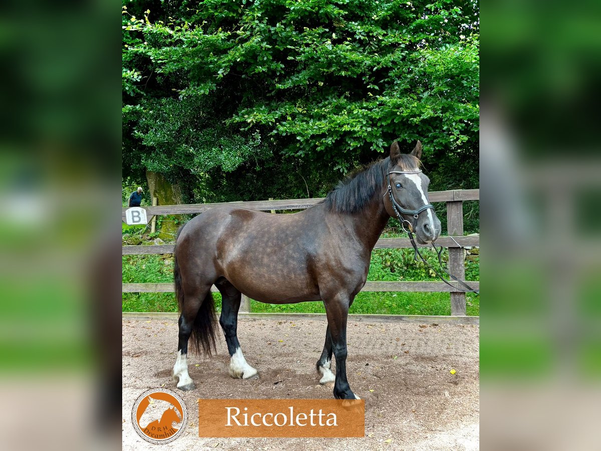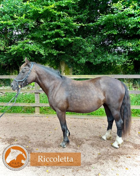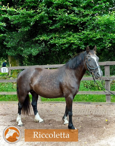 Black 13 yo Welsh D cob mare 142cm Our lovely Riccoletta is looking for her forever 🏡 as a riding pony. She had been with us all her life. She has been a riding pony, but also bred two foals. She is a motivated pony who enjoys groundwork, flatwork, a bit of jumping and hacking. We are looking for a home with a confident youth or a petit adult who would like to do a bit of everything. She had an injury to her right eye as a foal and has reduced vision however doesn’t affect her.