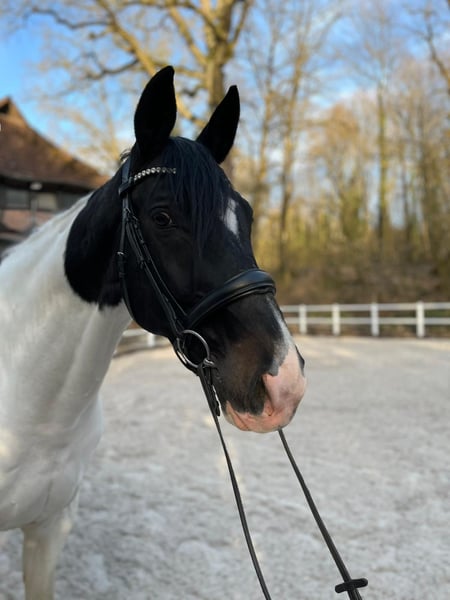Zum Verkauf steht ein attraktiver Westfalenwallach mit besonderer Optik und guter Abstammung; Belconi (Bellissimo) x Fidermark Der 2013 geborene Schecke hat ein Stockmaß von ca. 1,73 m und ist auf L-Niveau ausgebildet. Er verfügt über drei gute Grundgangarten. Er war mehrere Jahre zuverlässig im Schulbetrieb im Einsatz, weshalb er über viel Routine verfügt. Auch kleinere Sprünge meistert er problemlos. Zudem ist er geländesicher und kennt unterschiedliche Einsatzbereiche. Er wurde ebenfalls im Voltigieren eingesetzt, sollte dies jedoch künftig nicht mehr ausüben. Charakterlich zeigt er sich zuverlässig und brav im Umgang. Unter dem Reiter ist er ehrlich – er steigt und bockt nicht, kann jedoch gelegentlich etwas „guckig“ sein, weshalb wir ihn eher für erfahrene Reiter empfehlen. Als ehemaliges Schulpferd weiß er zu schwache Reiter einzuschätzen. Für erfahrene Reiter macht er aber einen wirklich guten Job. Turniererfahrung ist vorhanden: Er konnte sich zuletzt in E- und A-Dressur platzieren. Aktuell ist er geimpft und regelmäßig entwurmt. Da er im intensiven Schulbetrieb nicht mehr glücklich ist und wir den Eindruck haben, dass ihm eine geringere Belastung und ein einzelner Bezugspartner besser entspricht, wünschen wir uns für ihn ein neues Zuhause mit abwechslungsreicher, angepasster Arbeit. Es wäre schön, wenn er bei seinem neuen Besitzer mehr Paddock oder Wiese genießen könnte. Bellagio kann jederzeit nach Absprache probegeritten werden. Standort Berlin. Video wird derzeit erstellt und kann dann angefordert werden.
