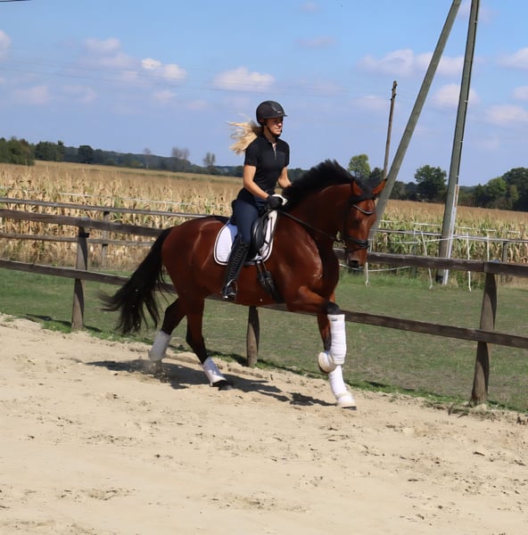 Zum Verkauf wird hier ein ausdrucksstarker 4-jähriger Wallach von Tomahawk - Don Frederic angeboten. Er stammt aus eigener Zucht und ist bei uns mit Familienanschluss aufgewachsen. Als Fohlen wurde er mit der goldenen Prämie ausgezeichnet. Die Mutter war erfolgreich bis M-Dressur. Der Wallach verfügt über 3 überragende Grundgangarten, eine hohe Versammlungsbereitschaft und zeigt sich in der täglichen Arbeit super rittig und gelehrig, was ihm den Weg in die schweren Klassen der Dressur ebnen wird. Er vermittelt dem Reiter ein tolles Gefühl, ist super sitzbequem und gleichmäßig in der Anlehnung. Zur Zeit befindet er sich altersentsprechend auf Dressurpferde-A Niveau und kennt bereits das Auswärtstraining. Ältere Röntgenbilder inkl. Rücken liegen ohne Befund vor. Preisvorstellung 23.000€