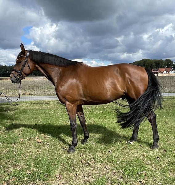 For sale is a 5-year-old brown gelding standing at 166 cm. Cloverleaf completed his first A show jumping competition last week (October 4th) with a solid clear round and a score of 7.4. In the course, he showed himself to be fearless and with a good work ethic; in the warm-up area, he was a bit afraid of oncoming horses but was manageable. At the jump, he demonstrates good scope, carefulness, and a nice bascule. He gives a secure and pleasant feeling and has a good, manageable pull to the jump. He is pleasant to ride in dressage and also behaves well out on the trails; he has successfully mastered his first experiences at the beach and in the mudflats. Due to his size and compact build, we could easily imagine him as a girl’s/lady’s horse. He is familiar with dogs, cats, goats, pigs, lunging systems, tractors, and all the equipment typically found on a farm, and he is herd-compatible. He is used to daily turnout and being stabled at night. Good X-ray images are available; he has a small, irrelevant chip in the left hind fetlock. Because of this and his apparent fear of other horses/traffic, he is being sold below value. A trial ride is possible at any time.