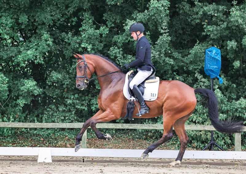 Bom Dia is een 5-jarige onbenutte en goed en gezond opgegroeide ruin die rechtstreeks van de fokker verkocht wordt. Hij is op 4-jarige leeftijd onder het zadel gebracht, maar is daarna weer met vrienden op de wei geweest en sinds het voorjaar van dit jaar onder het zadel. Hij heeft drie goede gangen, waarbij de galop bijzonder opvalt. Ook op wedstrijden is hij zeer braaf en heeft hij bij zijn tweede wedstrijd direct de Dressuurpaard A gewonnen. Zijn grootmoeder is bij ons al succesvol tot klasse S gegaan en zijn moeder valt op door haar bergopwaartse beweging en rijdbaarheid, die ze hem duidelijk heeft meegegeven. We zoeken een geweldig en ondersteunend thuis voor hem. Hij heeft ook een zeer goede keuring inclusief hals, rug, enzovoort.