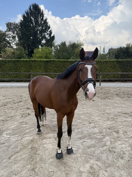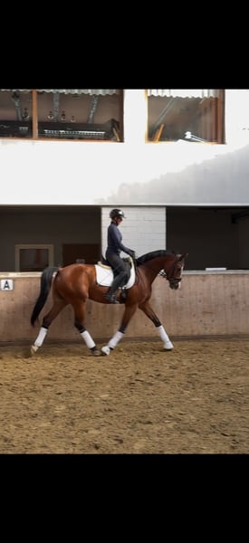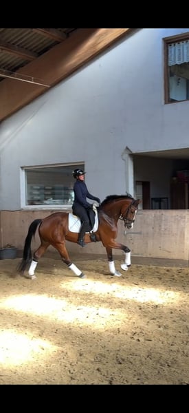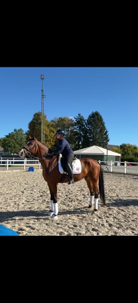 Zum Verkauf steht unser hübscher 6-jähriger Wallach, das erste Fohlen unserer Stute von Sir Donnerhall, welche mehrfach siegreich in St. Georg und Inter I war. - Abstammung: Benicio x Sir Donnerhall - Alter: 6 Jahre - Rasse: Westfale - Geschlecht: Wallach - Stockmaß: 171 cm - Ausbildungsstand: Dressur A-fertig (L-Lektionen begonnen), im Springen A-fertig Vielseitig einsetzbar, ideal für Dressur, ein kleiner Parcours ist auch kein Problem, aber auch sicher im Gelände, sowohl alleine als auch in der Gruppe Er ist sehr brav und unkompliziert im Umgang, ebenfalls schmiede- und verladefromm, ein guter TÜV (aus 2024) liegt vor. Ein echter Partner für ambitionierte Reiter: zuverlässig, nervenstark und dennoch mit genügend Temperament, um Freude am täglichen Training und an sportlichen Zielen zu bereiten. Abgabe nur in beste Hände. Eine pferdeerfahrene, liebevolle Familie ist Voraussetzung.