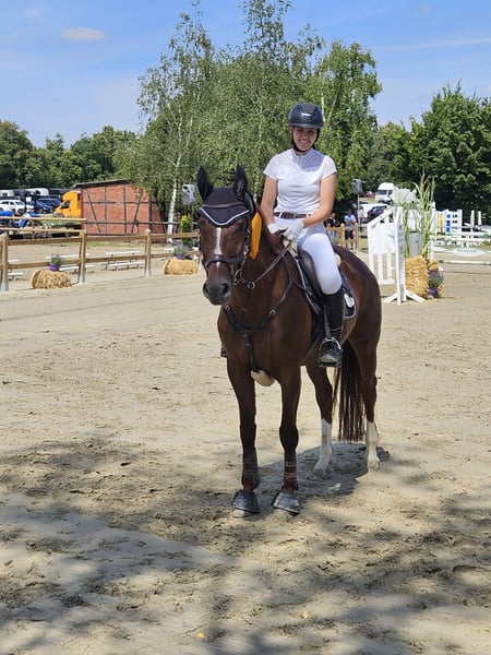Elegant Westphalian mare, born in 2016, seeking a new owner This beautiful dark chestnut mare, which we have bred ourselves, impresses with her striking appearance and versatile jumping talent. She demonstrates a good jumping technique. I have personally trained her and competed up to Medium (1.20 m). We have been successful and placed well in show jumping classes A and L (up to 1.15 m). Additionally, we have participated in team competitions at local tournaments, including cross-country phases. Florentina is an ideal partner for the ambitious leisure rider or the young rider looking for a show jumping horse to start in the A and L classes. If you are interested, I look forward to hearing from you to discuss further details and to give you a personal impression.