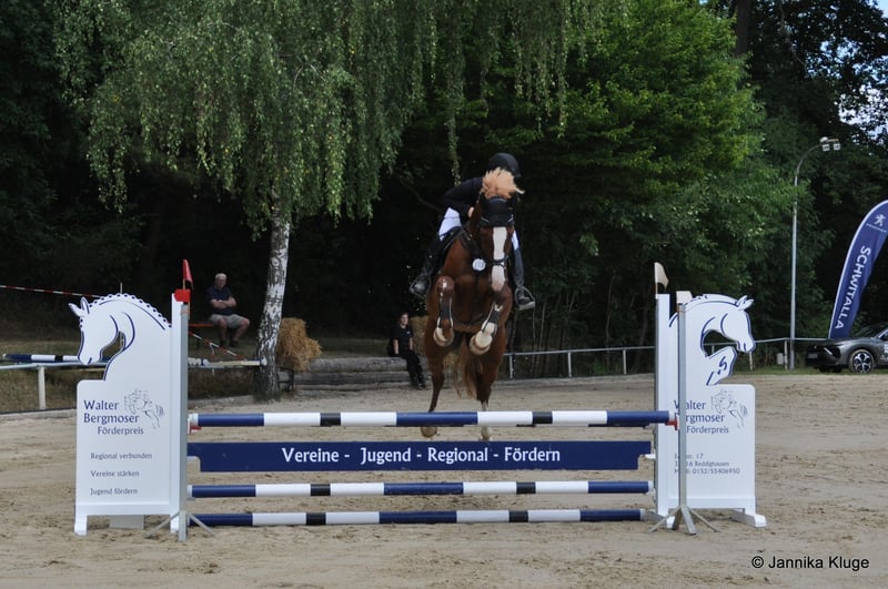 Beautiful chestnut mare named Adelheid, born in 2016, approximately 16.1 hands tall. Sire: All Music (by Arpeggio), Dam: by Hogwart. She has placed at the 1.40m show jumping level but has been primarily ridden for leisure in dressage and jumping recently, due to her retirement from competitive sport. She is unspoiled and in excellent condition. She enjoys jumping very much and has a lot of talent at the fences. With a few training sessions, she could quickly return to competition. Adelheid is very affectionate and loves cuddling, but during riding, she requires a confident, experienced rider, as she can sometimes be a bit stubborn. She has a very good conformation. She has a calm disposition and is easy to keep in contact with. Not a typical children's horse, but an enjoyable ride for a competent advanced rider. We purchased her as a foal from the breeder. She has been ridden by amateurs and is very well trained. Serious inquiries only, please. Adelheid is for sale and not available for loan. Upon request, I can send videos. She is being offered due to lack of time and her retirement from competition. Current jumping training videos available.