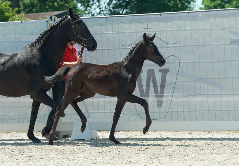 Dieses bewegungselegante Stutfohlen des viel besprochenen Warendorfer Landbeschälers DIAMANTENGLANZ überzeugt mit drei guten Grundgangarten, einer locker durch den Körper schwingenden Trabmechanik, seinem freundlichen und zugewandten Charakter sowie mit bestem Dressurblut. Mütterlicherseits bürgt Mutter Vater Wildfang (v. Winnetou/Ferdinand) für Rittigkeit und Springvermögen. Im weiteren Pedigree bringt der Trakehner Abendregen Adel und Härte in den Genpool. Mutter und Fohlen lassen sich ohne großen Aufwand verladen. Der Schmied ist ebenfalls kein Problem für die hübsche Stute.