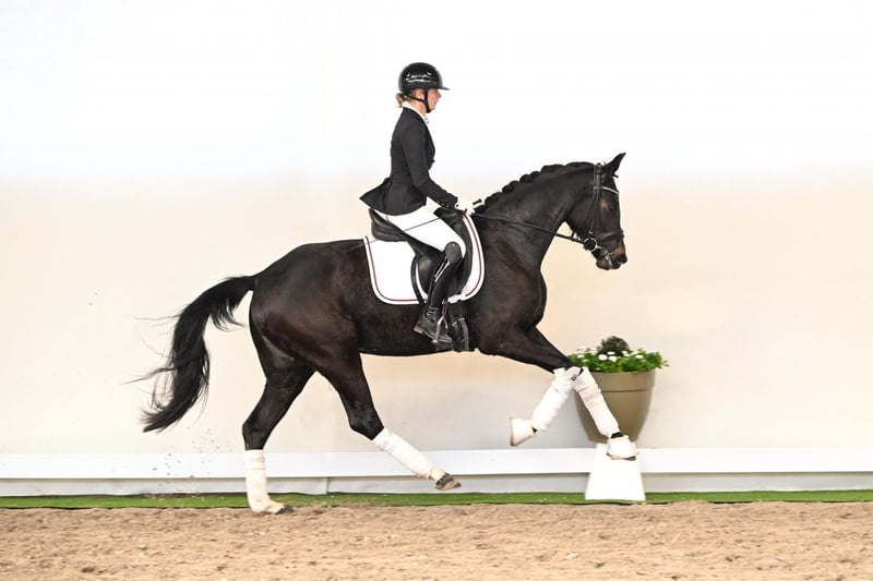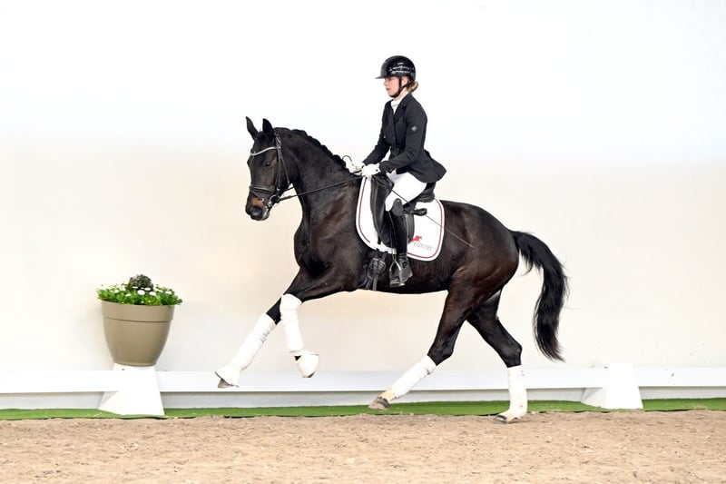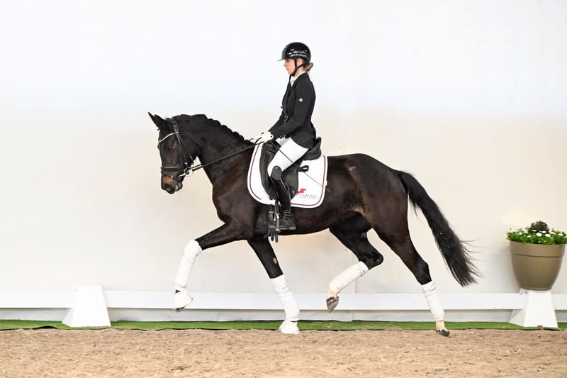 This three-year-old mare has already shown remarkable progress just five weeks after starting under saddle, as seen during her video session. For her young age, she is extremely rideable, demonstrating calmness and attentiveness—even in unfamiliar environments, during transport, and in a new arena. Her three gaits are of the highest quality: a lively, rhythmically correct trot, an uphill, expressive canter, and a ground-covering, supple walk. Even at this early stage, she shows extraordinary body control and balance, combined with a heart of gold—a mare sure to impress any rider. A pedigree that inspires confidence: Her sire, Diamantenglanz, is an exceptional stallion known for his expressive presence, dynamic, well-timed movements, and a consistently uphill canter. Currently progressing toward the higher levels, he impresses with his rideability, willingness to perform, and amiable character. As a sire, he consistently produces high-priced, successful offspring. This mare combines everything that makes a young horse desirable: expressive, powerful gaits, a willingness to learn, excellent rideability, and an outstanding character. A true talent that excites today and promises to shine in the higher levels tomorrow.