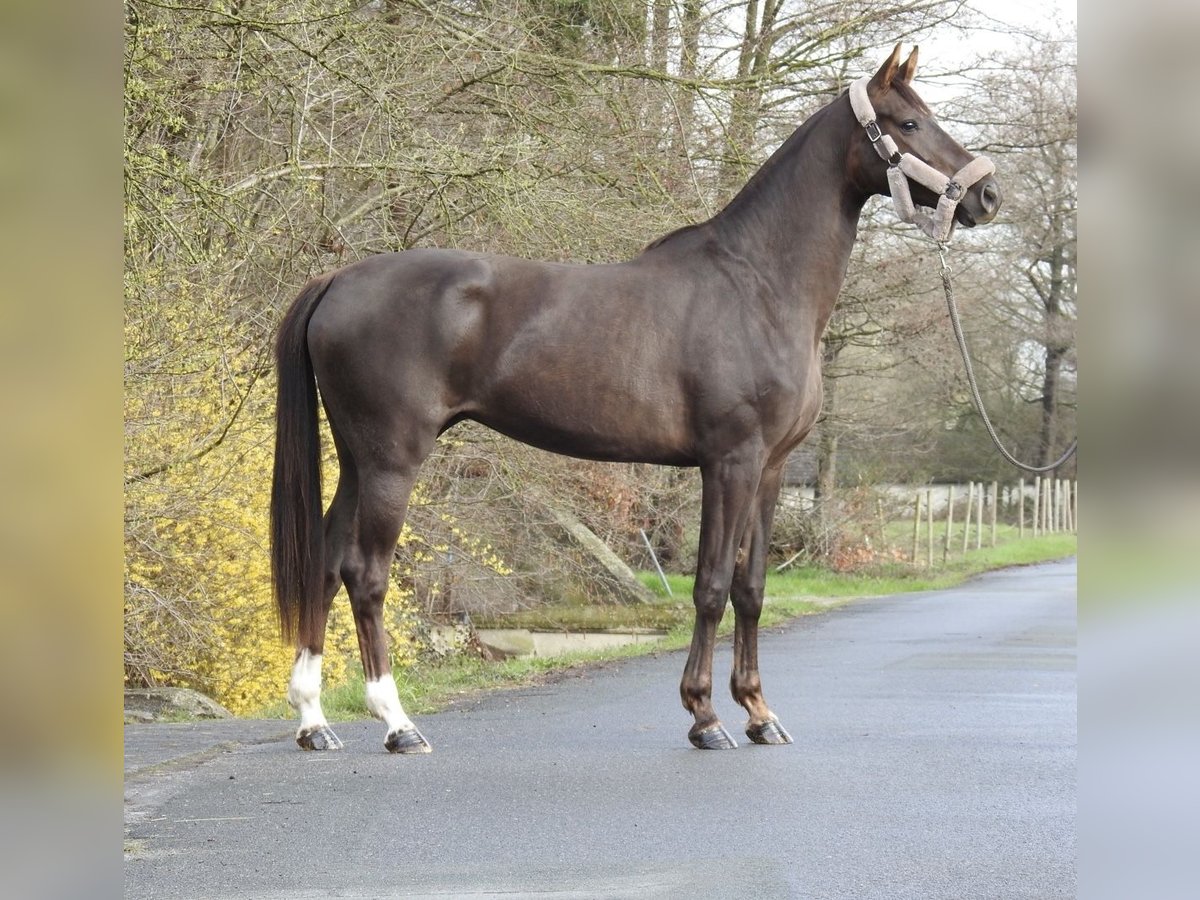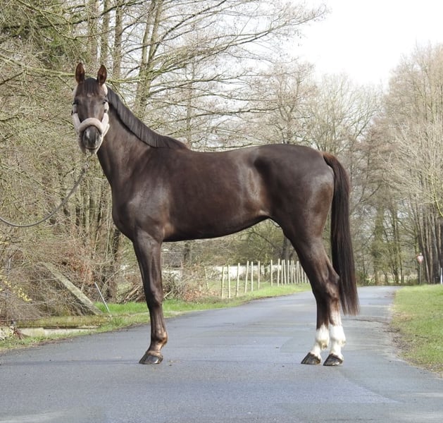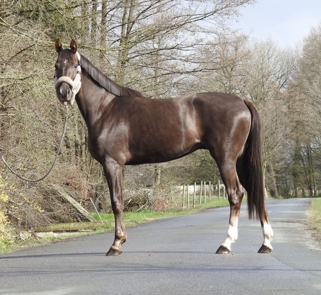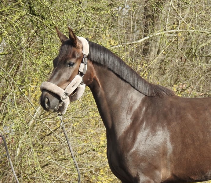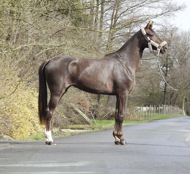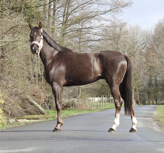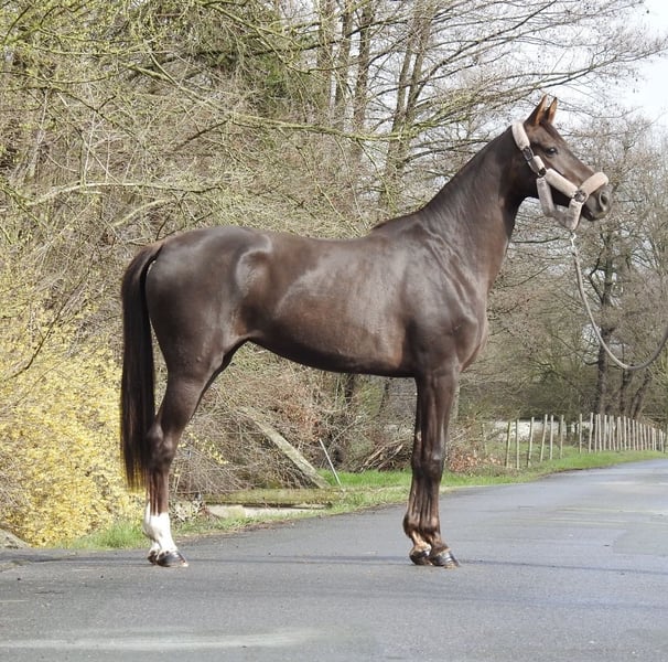 ❗️Due to the high volume of inquiries, we kindly ask that all questions be made by phone only.❗️ For sale is a 3-year-old dark chestnut mare with an approximate height of 16.1 hh. The mare has a very gentle and exemplary character and comes from excellent breeding. She has already been lightly lunged and is familiar with saddle and bridle. No further training has been requested or expected at this age. Due to limited training capacity, a decision has been made to sell her. She was raised in a mixed herd and is very socially compatible. We will not send videos of our horses without prior phone contact, so please refrain from requests such as "please send video." Viewings are possible at any time. For further questions, please feel free to call us at 0171 530 33 40. All rights to the images belong to Sport- und Freizeitpferde Wilfried Oestersandforth. Distribution or publication is strictly prohibited.