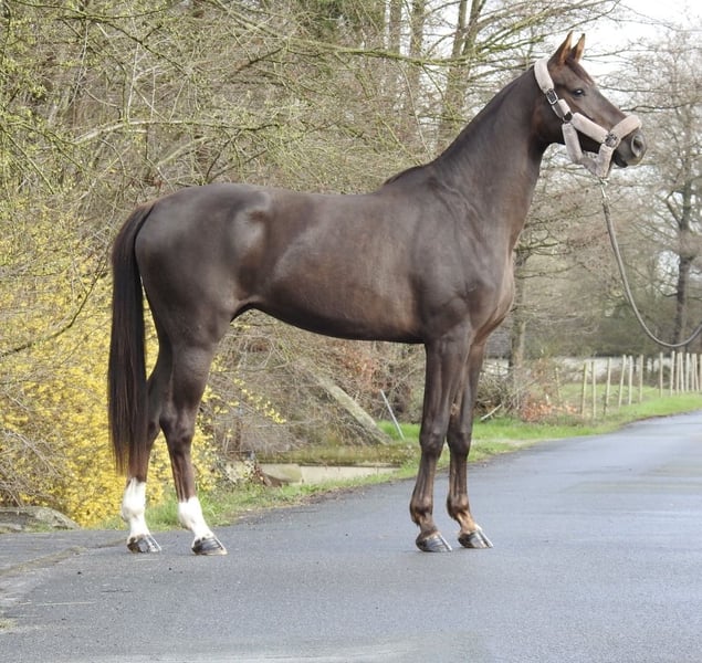 ❗️ En raison de la charge de travail importante, nous vous prions de privilégier les demandes par téléphone. ❗️ Nous proposons à la vente une jument baie de 3 ans, mesurant actuellement environ 1,65 m. La jument possède un caractère très doux et exemplaire, et provient d’un élevage de qualité. Elle est déjà légèrement mise en longe et connaît la selle ainsi que la bride. Aucun travail supplémentaire n’a encore été demandé d’en raison de son jeune âge. En raison d’un manque de capacités pour la formation, nous avons décidé de la vendre. La jument a grandi dans un groupe mixte et est très sociable. Sans contact téléphonique préalable, nous n’enverrons pas de vidéos de nos chevaux, merci de ne pas faire de demandes de « vidéo » sans cela. Les visites sont possibles à tout moment. Pour toute question, n’hésitez pas à nous contacter par téléphone au 0171 530 33 40. Tous les droits sur les images appartiennent à Sport- und Freizeitpferde Wilfried Oestersandforth. Toute diffusion ou publication est strictement interdite.