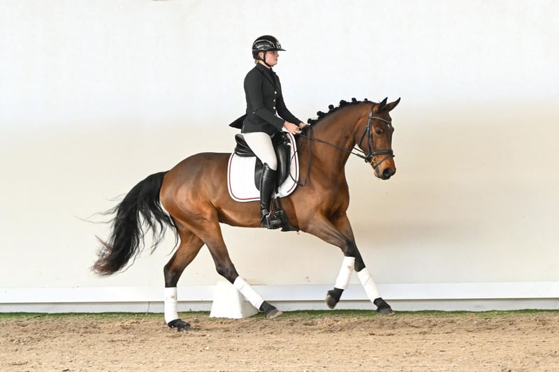 This charming four-year-old filly captivates with her friendly nature and natural calm, making her a true heart horse. With three solid gaits, refined handling, and a balanced temperament, she proves reliable and cooperative in her daily work. Still in the midst of her development, she has all the qualities to evolve into a modern top-level dressage horse. Her pedigree combines the finest lines of German dressage breeding: her sire, Sir Escolar, premium stallion and a prime example of elegance and quality, impresses with outstanding movement, spectacular trot, expansive walk, and expressive canter. The dam’s sire, Zoom, Westphalian dressage reserve champion, contributes excellent gaits, exceptional shoulder freedom, and swinging, ground-covering movement. Fürst Piccolo, as the dam’s dam sire, completes the pedigree, renowned for his remarkable character, outstanding offspring, and unmistakable dressage quality. This filly presents as a harmonious, willing-to-learn horse with natural self-carriage, uphill movement, and a rideability that makes every session effortless. From the first moment, she offers joy, confidence, and the chance for any rider to showcase her quality. A horse for those seeking a promising young dressage prospect with character, three strong gaits, and natural presence – ready to grow into a true champion.