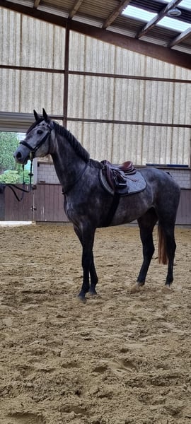 This stunning mare impresses both with her pedigree and her outstanding natural talent. Her movement quality is top-notch, combined with strength, elasticity, and impressive impulsion, making her an ideal sport horse. She was allowed to mature calmly until the beginning of her fourth year. She has been under saddle for three months now. Character-wise, she is very affectionate and sensitive. She is very compatible with other horses, free of eczema, and has a breeder's health certificate prior to starting under saddle with no findings! A raw diamond for a skilled and nurturing rider.