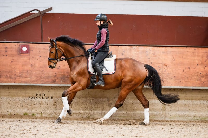 Suki is a promising dressage prospect with excellent movement dynamics and three outstanding basic gaits. She is energetic and forward-moving, with sensitivity and finesse in her aids, yet always well-behaved and completely free of spookiness or nervousness. She is rideable, seat-sound, and possesses the necessary 'speed' within her gait, despite her abundant momentum. Her hind leg is particularly impressive. Suki has already experienced the competition atmosphere and has placed in A-level dressage tests. She is completely unspoiled by her breeder and is ready for the big arena; further training will pay off and bring her much joy. Viewing and falling in love is highly recommended! A recent TÜV report from 01/2025 is available, including her neck, and Suki is EVCM-free.