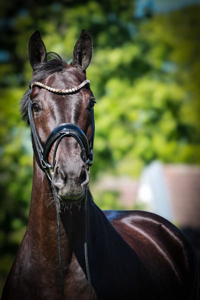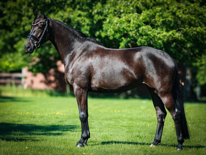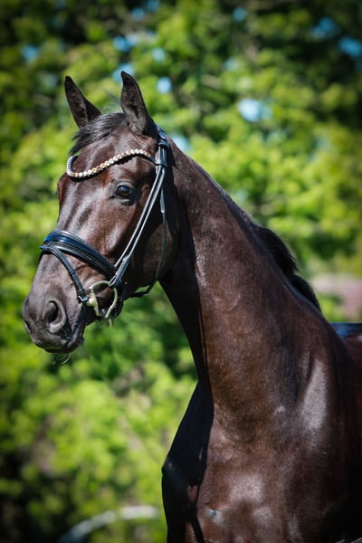 Karla is a 4-year-old black-brown mare by Kardieno (by Dante Weltino). She was backed in November of last year and is currently on her way to competing in the dressage horse A level. She is well-behaved in handling and is familiar with paddocks and the horse walker.