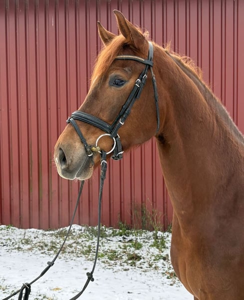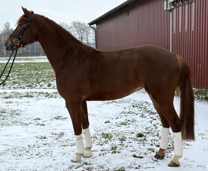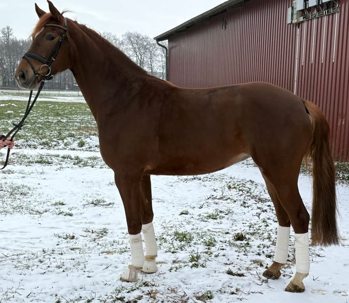 Elegant Westphalian mare – dark chestnut, born in 2021 For sale is a beautiful Westphalian mare, born in 2021. This impressive mare captivates with her noble appearance and balanced temperament. Standing at 16.1 hh, she makes a striking presence in the dressage arena. She is ideal for ambitious dressage riders who value quality and expressive movement. The mare is well-trained, eager to learn, and shows great talent for dressage. Her friendly nature makes her suitable for both experienced riders and advanced riding students. If you are interested or have further questions, please feel free to contact me. Arrange a viewing to meet this exceptional horse in person!