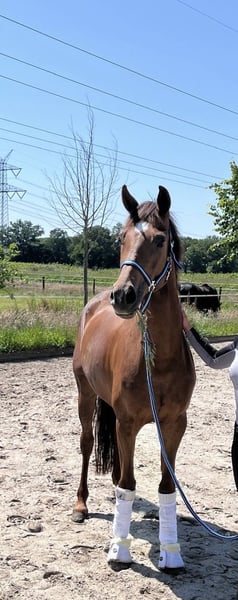 For sale: a young Vaderland/Vitalis Westphalian mare Sold at the Westphalian auction at 2 years old. Light-footed, dressage horse at L level, suitable for ladies, children’s tours, juniors, and young riders. Very uphill movement with a high degree of collection. Well-behaved and brave, familiar with terrain, arena, and off-site training. Has not yet been presented publicly. Excellent health, no prior medical issues. Occasionally nods after eating.