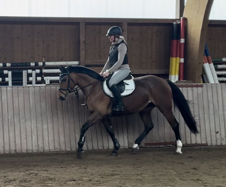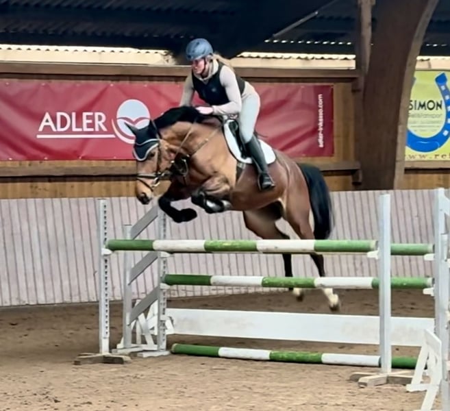Creative is a beautiful and very charming 16.1 hh mare. She is so well-behaved that she can be ridden effortlessly by children. She is trained up to novice jumping (Class L) and has achieved placings in amateur competitions. She is absolutely safe and reliable, forgiving of mistakes and providing confidence to her rider. In dressage, she is easy to ride and very well-behaved. She is being sold by the breeder due to herd reduction. She has never been ill. Visits for a test ride are welcome. Caytens x Lacoste, born in 2020 Currently barefoot and uncomplicated.
