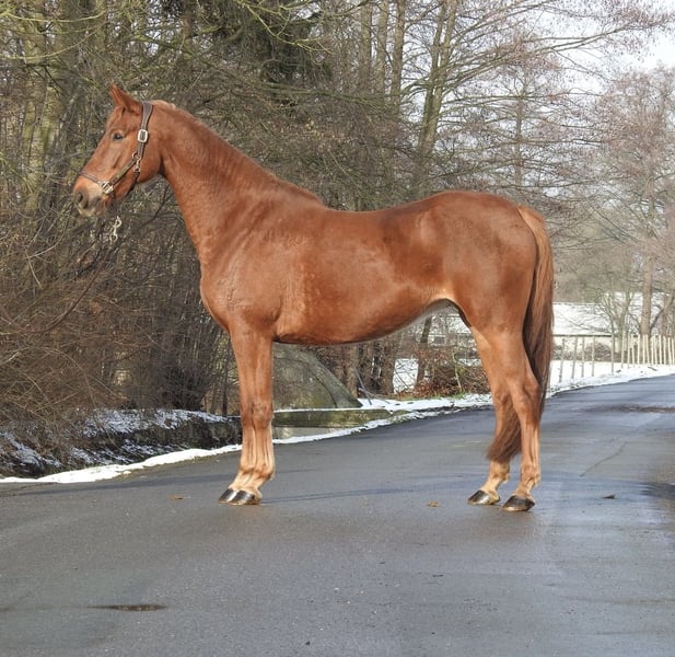 Please note that due to the high volume of inquiries, we kindly request only phone calls. For sale is a 7-year-old chestnut mare with an approximate height of 1.63 meters. The mare comes directly from the breeder, was briefly backed at age 4, and has since been kept for breeding out of personal interest. We would describe her character as very balanced and clear-minded; she remains well-behaved and uncomplicated even in new situations. Due to a reduction in herd size, she was not bred this year and has now been sold. We do not send videos of our horses without prior phone contact, so please refrain from requests such as "please send video." Viewings are possible at any time. For further questions, please feel free to contact us by phone at 0171 530 33 40. All rights to the images belong to Sport- und Freizeitpferde Wilfried Oestersandforth. Distribution or publication is strictly prohibited.