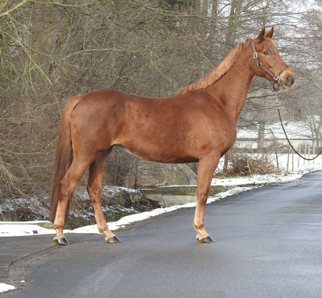 ❗️Wir bitten aufgrund des hohen Schreibaufwandes ausschließlich um telefonische Anfragen.❗️ Zum Verkauf steht eine 7-jährige Fuchsstute mit einem Stockmaß von ca. 1,63 m. Die Stute kommt direkt aus Züchterhand, wurde 4-jährig kurz angeritten und befand sich seitdem interessehalber in der Zucht. Wir würden Ihren Charakter als sehr ausgeglichen und kopfklar beschreiben, sie bleibt selbst in neuen Situationen brav und unkompliziert. Aufgrund von Bestandsverkleinerung war sie für dieses Jahr nicht tragend und wurde nun schlussendlich verkauft. Ohne vorherigen telefonischen Kontakt werden wir keine Videos unserer Pferde verschicken, daher bitte von Anfragen „bitte Video schicken“ absehen. Besichtigungen sind jederzeit möglich. Für weitere Fragen stehen wir gerne telefonisch unter 0171 530 33 40 zur Verfügung. Alle Rechte an den Bildern gehören Sport- und Freizeitpferde Wilfried Oestersandforth. Eine Verbreitung oder Veröffentlichung ist strikt untersagt.