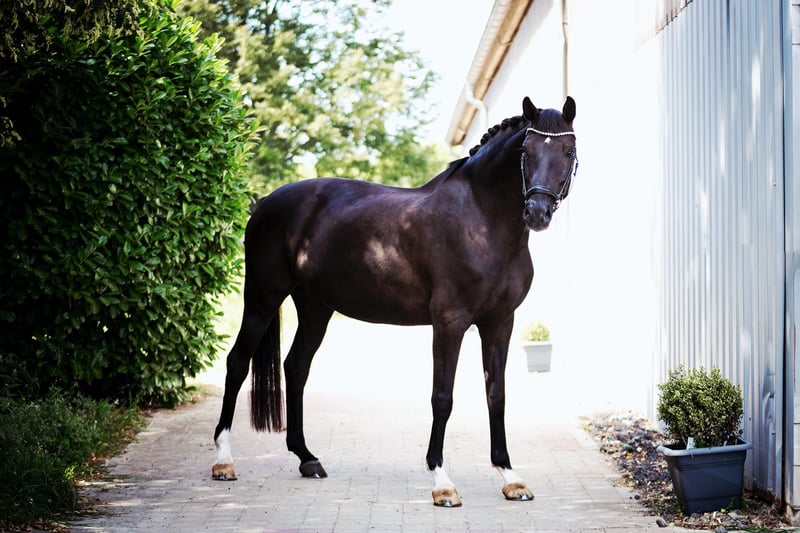 Offered here is a beautiful mare by the exceptional stallion Secret. With her stallion type, she also accommodates larger riders very well. Having placed in riding horse tests up to M**, including several victories this year in dressage horse tests of class M, she is currently being prepared for her first starts in S. She is also always ready for jumping and nice rides in the countryside, and we hope for her future sport partner that variety will not be lacking. In terms of character, the mare is a 12/10, very well-behaved, and naturally easy to shoe and load.