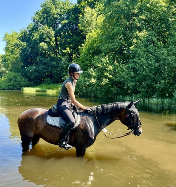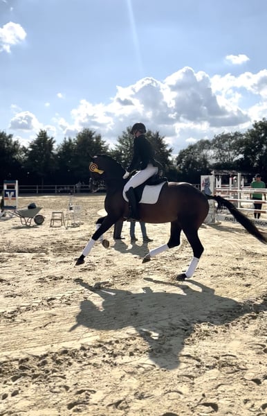 Schweren Herzens suche ich für meine Stute (geb. 2018), ca. 1,75 m groß, schwarzbraun, ein neues Zuhause. Sie ist Dressur gezogen, hat aber auch im Springen viel Talent und Spaß! Sie ist Brav im Umgang, beim Schmied und beim Verladen (auch alleine kein Problem). Kennt ein paar Zirkuslektionen. • Dressur: Siegreich in A-Dressur mit 7,5, beherrscht Lektionen auf L-Niveau. Erste Wechsel springt sie bereits auch, Traversalen begonnen. • Springen: Mit Wertnote 8,4 im A-Springen drittplatziert. • Gelände: Erste Geländesprünge problemlos gemeistert. Sie hat eine enorme Bewegungsqualität und braucht daher einen versierten Reiter, der qualitätsvolle Bewegungen reiterlich verarbeiten kann. Sie möchte grundsätzlich alles richtig machen, aber man stößt schnell an seine Grenzen, wenn man das Potenzial nicht händeln kann. Sie zeigt sich unter erfahrenen Reitern immer bemüht und lernt sehr schnell. Für Anfänger ist sie allerdings nicht geeignet, deshalb bitte von entsprechenden Anfragen absehen. Gesucht wird ein technisch versierter Reiter auf mindestens M-Niveau um sie entsprechend fördern zu können. Kleine Befunde liegen vor und wird daher weit unter Wert abgegeben. Mit guten Management steht einer Sportkarriere nichts im Weg. Ich verkaufe sie, da es zwischen uns reiterlich leider nicht vollumfänglich passt. Details hierzu gerne in einem persönlichen Telefonat.