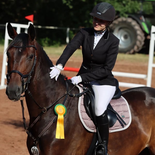 Ich biete meine 8jährige Stute Rose Mary zum Verkauf als Freizeitpferd oder für die Zucht an einen Bestplatz an. Rosi wurde von mir dreijährig schonend und abwechslungsreich ausgebildet und bis zur Klasse L in der Dressur siegreich vorgestellt. Im Springen wurde sie bis Klasse A vorgestellt. Rosi ist ein braves und gehorsames Pferd und bereitet stets Freude. Sie ist sehr leicht im Maul und der Anlehnung. Sie geht alleine ins Gelände, lässt sich alleine verladen, steht artig beim Schmied und kennt Koppelgang in der Herde. Meine Turniere oder sonstige Ausflüge habe ich mit ihr in der Regel alleine gemacht. Von Verladen über Ausladen, fertigmachen und reiten ist alles alleine möglich. Rosi hat allerdings zwei Handicaps. Zum einen steht sie bodenweit, ihre Vorderhufe zeigen beide etwa 30-45 Grad nach außen. Röntgenologisch unauffällig. Fünfjährig hatte sie eine Hufgelenksentzündung, welche ich sehr früh bemerkt und behandelt habe. Seitdem habe ich das Springen auf Gymnastik oder vereinzelte Sprünge reduziert und keine Probleme damit. Ich habe allerdings Pflege der Hufgelenke betrieben, gerne mehr dazu in einem persönlichen Gespräch. Das zweite Handicap zeigte sich nun nach meiner Schwangerschaft. Rosi hat an zwei Stellen im Rücken Engstände der Dornfortsätze. Diese habe ich nie bemerkt, jetzt allerdings durch meine reiterliche Pause eben doch. Rosi lief die letzte Saison erfolgreich in A und L mit einer jungen Reiterin und zeigte nun erst im Winter diese Problematik. Der Rücken ist behandelt und bei richtigem Training sollte er auch keine Probleme machen. Training, für das ich leider keine Zeit mehr habe und ihr dadurch nicht mehr gerecht werden kann. Ich wünsche mir für Rosi ein Zuhause, bei dem sie die Nummer 1 ist. Abwechslungsreiche, rückenfreundliche Arbeit, Weidegang, idealerweise Paddockbox und ein pferdegerechter Umgang wären mir wichtig. Aufgrund ihrer Abstammung Rock forever x Benetton Dream auch für die Zucht vorstellbar. Gerne bin ich telefonisch für Sie erreichbar und beantworte alle Fragen zu Rosi. Kein Notverkauf, nur in beste Hände abzugeben! Ein Probereiten ist gegen eine Gebühr von 50€ möglich.