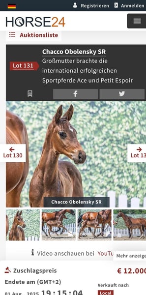 Hoch moderne Tochter des Weltklasse Vererbers "Cornet Obolensky". Die auf Grund ihrer Qualität über Trägerstuten auch zur Zucht eingesetzt wurde. Es wurde am 01.08.25 erst wieder ein Fohlen von ihr für 12.000,-€ versteigert. (siehe Foto und Video) Parallel konnte sie ihre ersten Parcours sehr vielversprechend absolvieren und sich in Spr. M (1,30m) platzieren und siegen. Die Stute ist ausgestattet mit dem Vermögen ihres prominenten Vaters und verfügt über drei hervorragende Grundgangarten (die sie auch ihren Nachkommen mit gibt) sowie sehr gute Reiteigenschaften. Im täglichen Umgang ist sie sehr brav. Es handelt sich um einen top Sportler für den gehobenen Sport, der auf Grund seiner außnahme Gene auch hochinteressant für die Zucht ist. Telefon: +49 (0) 171/4605744