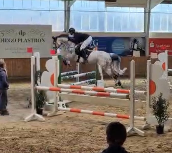 Na sprzedaż piękna 9-letnia klacz Christiano x Barring xx, bezpośrednio od hodowcy! Catalaya ma około 1,66 m wzrostu i doskonałe cechy użytkowe. Przyciąga swoją codzienną chęcią do pracy oraz spokojną ujeżdżalnością. Na parkurze wyróżnia się przyjemnym galopem i ambicją. Może być również obsługiwana przez mniej doświadczonych jeźdźców! Obecnie posiada wyniki A** i L w skokach przez przeszkody! Hamulce Przyzwyczajona do załadunku Dostępne zdjęcia rentgenowskie W razie pytań, chętnych na dodatkowe informacje lub filmy, proszę o kontakt pod numerem 01626248014!