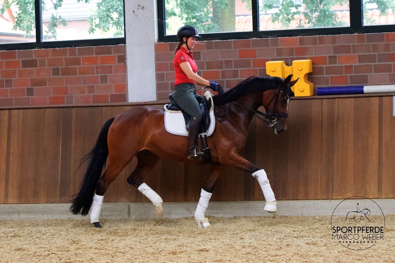 estfale | Klacz | *2017 | ok. 1,65 m ⚜️ Fürst von Soest x Diamond Hit ⚜️ ✨ Cudowna klacz westfalska z jakością i charakterem! ✨ Ta piękna, typowa klacz przekonuje trzema bardzo dobrymi podstawowymi chodami oraz delikatnym, szczerym charakterem. Posiada świetne podejście do pracy i wystarczający potencjał, aby przy odpowiednim wsparciu pewnie przejść do wyższej klasy. Klacz została zakupiona w wieku czterech lat, więc miała wystarczająco dużo czasu na rozwój fizyczny i psychiczny. Już teraz opanowała pierwsze elementy wyższej klasy w sposób zabawny. Zmiany w locie nie są jeszcze całkowicie pewne, ale jest niezwykle chętna do nauki i przy dalszym szkoleniu wszystko zrealizuje niezawodnie. ✨ Szczególnie godne uwagi: Klacz była dotychczas jeżdżona przez absolutną amatorkę bez odznaki jeździeckiej – dlatego też nie była jeszcze szeroko prezentowana na zawodach. Niemniej jednak ma już na swoim koncie kilka miejsc i zwycięstw w klasie A w ujeżdżeniu. Jest również dobrze obsługiwana przez słabych i przestraszonych jeźdźców, zawsze zapewniając bezpieczne i przyjemne uczucie podczas jazdy. Sukcesy: Wygrane w klasie A w ujeżdżeniu. Konie, w których dalsze szkolenie na pewno się opłaci. Niezależnie od tego, czy jako koń sportowy, czy towarzysz do rekreacji – ta klacz nadaje się w równym stopniu. Klacz była prawidłowo szkolona, z miłością pielęgnowana i wzorowo utrzymywana – co odzwierciedla się w jej zrelaksowanym i bezproblemowym zachowaniu. ✔️ Posiada dobry, ale nieaktualny przegląd TÜV. Miejsce: Warendorf Szczegółowe informacje: +49 173 3013499