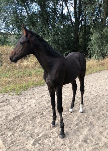 Zum Verkauf steht ein herausragendes, bewegungsstarkes und langbeiniges Stutfohlen mit interessantem Pedigree: Diamantenglanz x Riccio x Ehrentusch – eine leistungsgeprägte Anpaarung mit Potential für den gehobenen Sport. Das Fohlen überzeugt mit klarer Aufwärtstendenz in allen drei Grundgangarten, beeindruckender Mechanik und natürlichem Gleichgewicht. Typvoll sowie elegant und dabei korrekt im Fundament und mit viel Ausdruck. Das stilvolle Stutfohlen ist klar im Kopf, aufmerksam und absolut brav im Umgang.