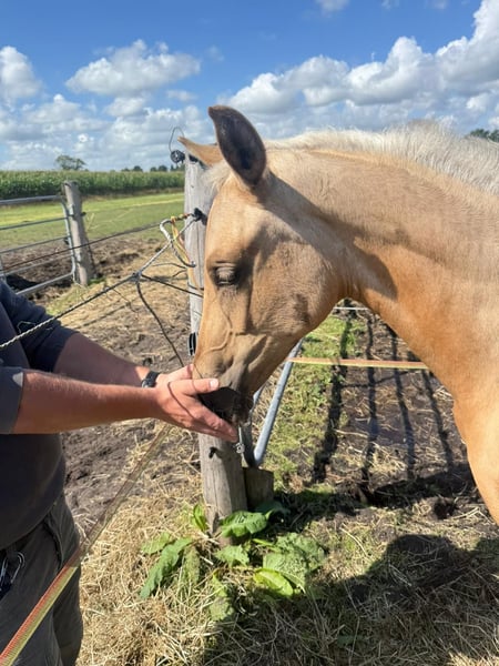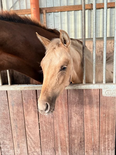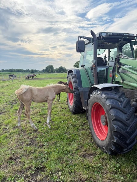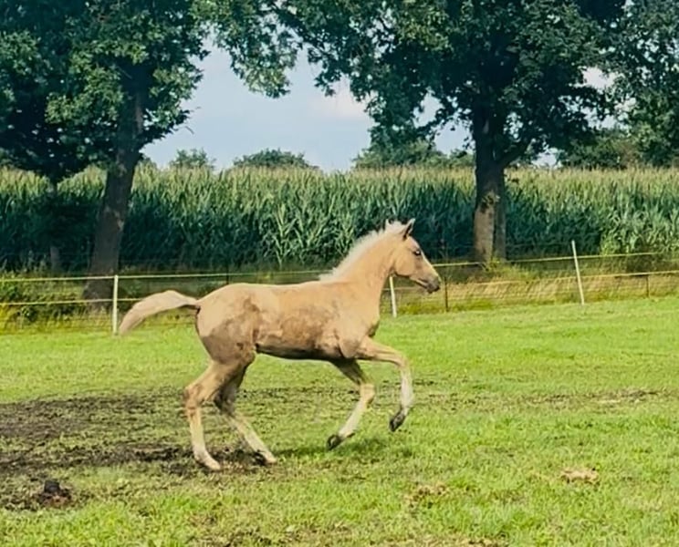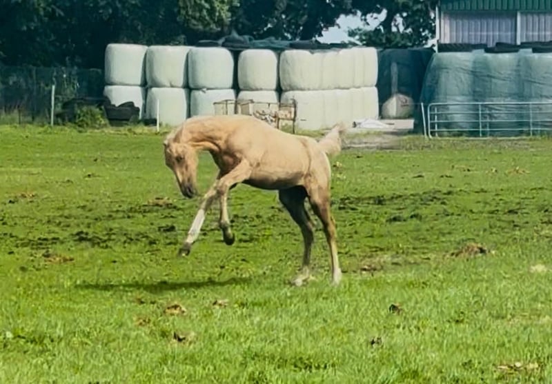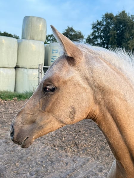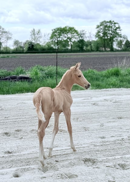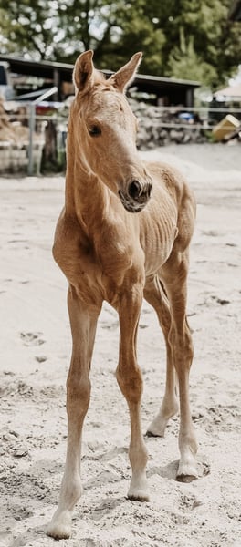 Hermosa potra palomino de gran tamaño, hija de Qaside MD x Damon Hill x Romantic Boy, en venta. Fue subcampeona en la exposición de potros en Hinte. Nacida el 30 de abril de 2025. ¡Solo en manos comprobadamente responsables! Ubicación: 26632 Ihlow