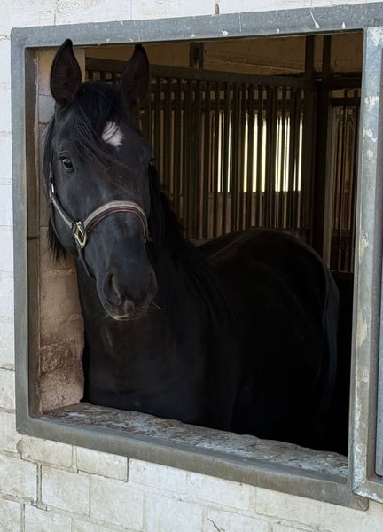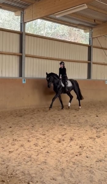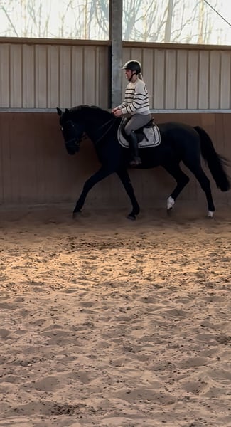 Er wurde Mitte/Ende Mai 2025 angeritten und hat bereits ein paar Sprünge unterm Sattel gemacht. Im Großen und Ganzen noch nicht weit geritten
