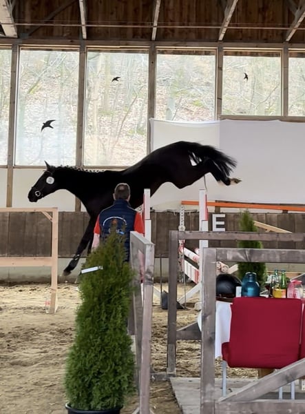 Se vende un prometedor semental de alta calidad con abrigo negro, nacido en abril de 2022. Fue montado a mediados/finales de mayo y ya ha realizado algunos saltos bajo la silla. TUV disponible: Impecable. Altura actual aproximada: 1.70 m. Línea de sangre: Cornet de Semilly x Classe VDL x Lupicor x Cor de la Bryere. Este semental, excepcionalmente elegante y con un fuerte carácter, aporta una gran calidad de movimiento y capacidad, con un notable estilo de salto. Es una garantía y un portador de esperanza para la gran gira. A mediados/finales de marzo: Campeonato de salto libre. Los jueces elogiaron especialmente sus movimientos por encima de la media, su calma y serenidad, así como su capacidad en el salto. Esto se recompensó directamente con una calificación de 8,8.