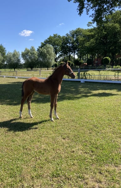 This extremely correct and typey colt in beautiful presentation convinces with tact, space grip and movement elegance - especially the expansive and tactless step is of special quality. The son of the expressive Warendorfer Landbeschälers SELECTRIC (v. Sezuan - De Kooning - Weltmeyer) is very devoted to people and well-behaved in his dealings. His pedigree with current and proven performance blood suggests a good dressage suitability with great riding horse points. Dam Etienne la Petite was herself victorious several times and placed up to dressage class S. She wears the precious blood of the Ehrentusch and the mother father Pik Labionics in the pedigree and has a "dream character".