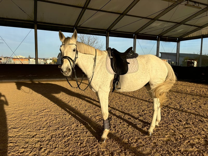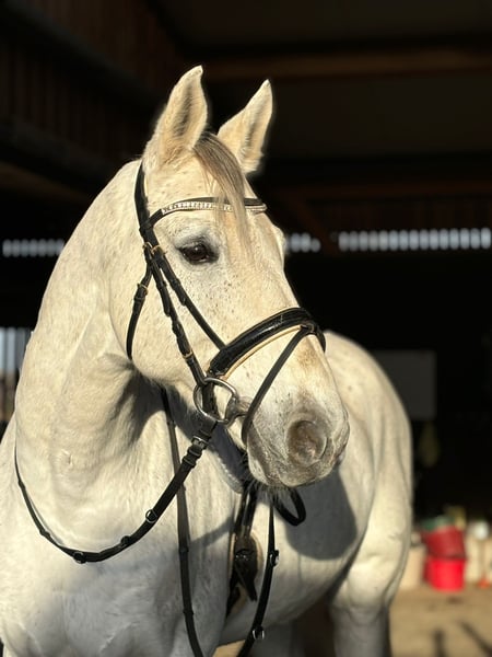 Merlin ist ein großer, braver Wallach, der ein angenehmes Reitgefühl vermittelt. Für unseren eher auf Anfänger ausgelegten Schulbetrieb hat er eine etwas zu große Galoppade, darum geben wir ihn ab. Er kann kleine Sprünge machen, dies macht er sehr brav, allerdings sollte er nicht zu oft gesprungen werden, da er früher mal eine Verletzung hatte, die aber aktuell vollständig auskuriert ist. Merlin kennt Paddock und Weide und steht bei uns in einer Paddockbox. Er verträgt sich sehr gut mit seinen Nachbarn. Im Gelände ist er brav und auch sonst unerschrocken, er lässt sich longieren und auch mit Ausbindern reiten.