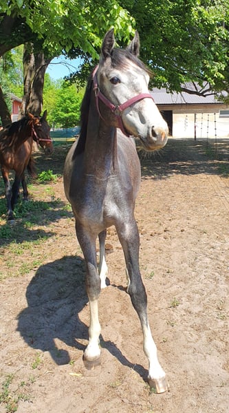 Offered for Sale: Grey Filly of the Zangersheide breed, born April 12, 2024. Dam: Scala by Silvio II, show jumping performance up to L level Sire: Air Jordan Alphaz This filly has great potential for show jumping. She is regularly vaccinated, dewormed, and trimmed. Familiar with all basic handling - grooming, tying, leading. Easy to handle and cooperative with veterinary care. She has elegant gaits, a pleasant temperament, lively yet with a good character. Naturally a bit dominant but non-confrontational. Raised outdoors 24/7.