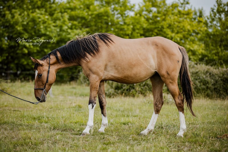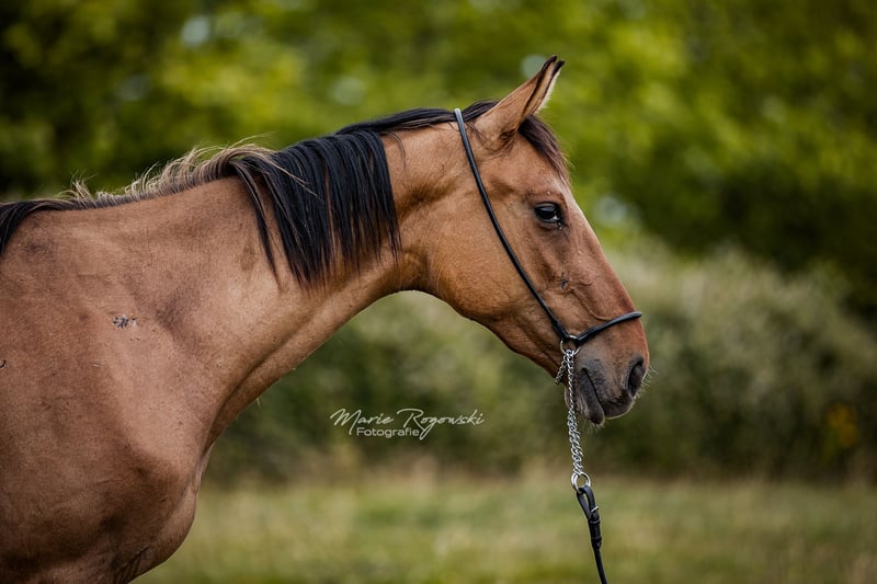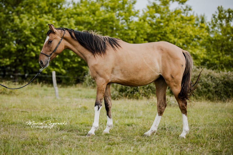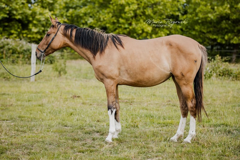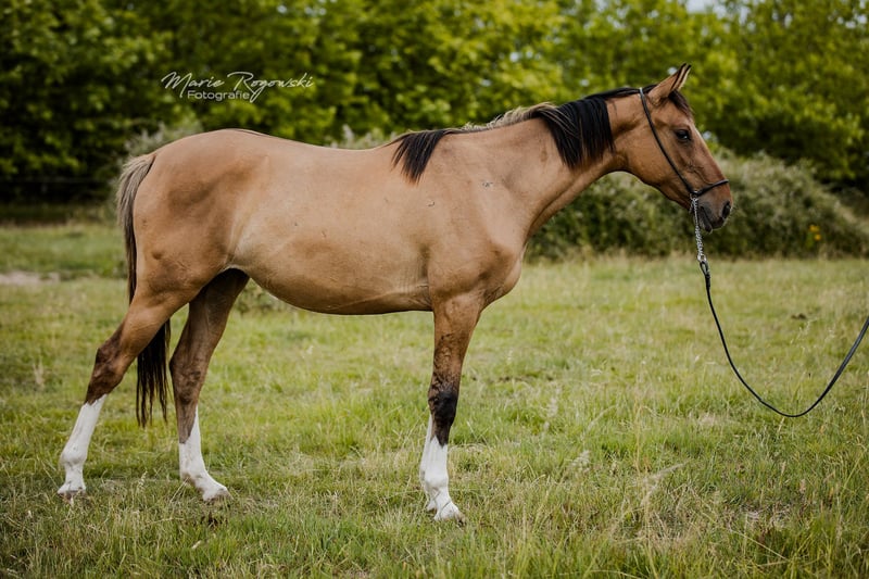 Stute | Zangersheide | Braunfalbe| geb 2022. | 150 cm LADY IN DUN Z ist eine charmante, gut proportionierte Jungstute mit auffälliger Braunfalb-Farbe. Sie zeigt sich im Umgang freundlich, neugierig und ausgeglichen. Ihr Vater Letter of Marque wird als außergewöhnlich braver, ehrlicher und ausgeglichener Vollblüter beschrieben, der auch in ungewohnten Situationen gelassen und zuverlässig bleibt. Ihre Mutter Funny Girl ist eine seltene Falbstute, die ihre besondere Farbvererbung in die Nachzucht weitergibt und eine tolle Mutterstute ist.