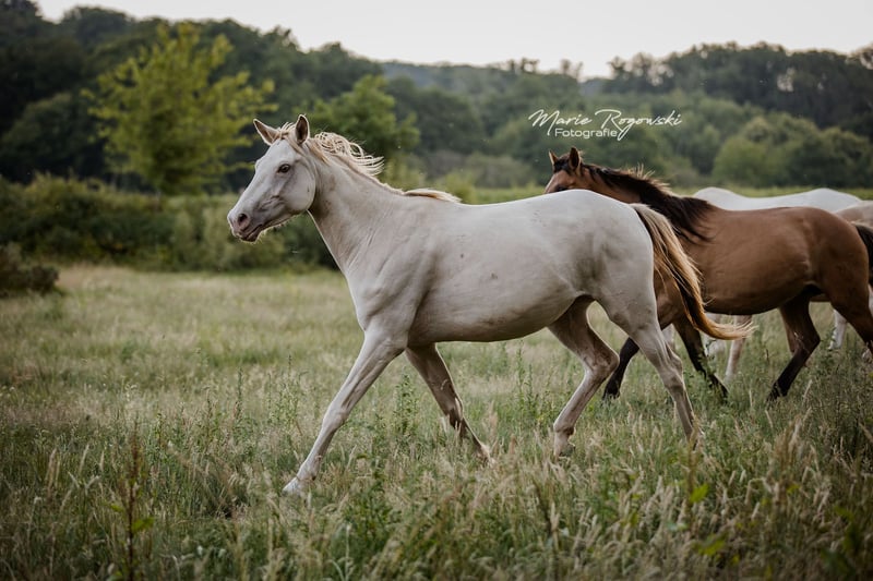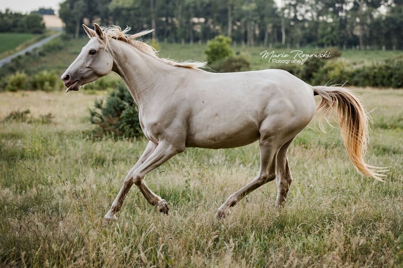 Zangersheide mare | born 2020 | Classic Cream Champagne (E/e, a/a, Ch/n) DELIKATESSE Z combines striking special colouring with significant dressage pedigree. Her sire Desperados FRH was number 1 in the world rankings in 2016 and remains one of the most successful dressage horses of all time – both in terms of sport and breeding. This young mare is sensitive, expressive and has a noble appearance with a harmonious conformation. She is currently unbroken and knows the basic handling procedures. Due to her special genetics (Champagne carrier), she is also suitable for colour-oriented breeding projects in the upper dressage arena.