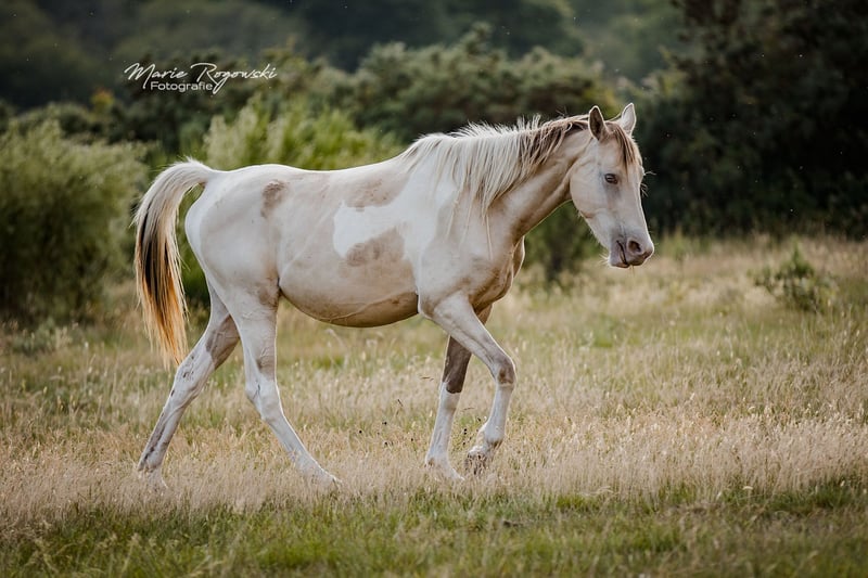 Mare | Zangersheide | Champagne Tobiano | born 2020 | currently 155 cm KHAFFEE AU LAIT Z is an elegant young mare with an unusual colouring – Champagne Tobiano – and athletic lines. She is attentive, well-balanced and friendly in the herd, with confident movements and good presence. With her modern type and interesting genetics, she is suitable both as a future riding horse and for breeding. Her sire, Khaffee Kharamel GF, is a performance-tested Arabian partbred stallion with 93.75% Arabian blood. He is known for his harmonious, expressive offspring, which are in demand both in riding pony breeding and in the warmblood sector. The dam, Magical Dream GF, is a striking Trakehner piebald mare who brings substance, rideability and a clear sporting character to the mix. This pairing combines charisma, colour and proven riding horse quality.