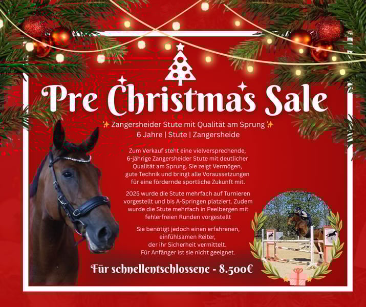 Zum Verkauf steht eine tolle 6-jährige Stute mit viel Qualität und Vermögen am Sprung. A-Springen platziert, Peelbergen mehrfach fehlerfrei gesprungen. Sie wurde immer von einem Kind geritten, dieses ist jedoch aufgrund des kommenden Schulabschlusses und eines weiteren Pferdes in einer Situation, wo es der Stute zeitlich nicht mehr gerecht wird. Sie wird in fördernde Hände verkauft und ist kein reines Kinder- oder Anfängerpferd. Kein Steigen oder sonstige Unarten. Für weitere Informationen bitte ich um eine Nachricht oder einen Anruf unter 0178-1892928.