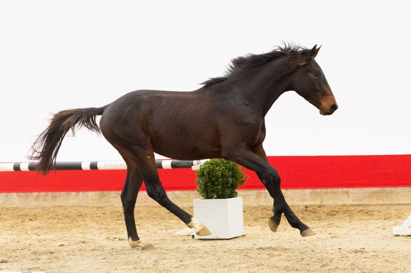 Happily selected: Dontharsio de la Herbougere Z, a two-year-old, very complete horse to look at. He has a very good canter, is light-footed and nicely uphill-built. Sire Donthargos is an Oldenburg premium stallion with an interesting pedigree: Don Diarado (1.70m GP) x Conthargos x Lordanos. He is seven years old and has already competed at international 1.30m level with Karl Brocks (GER). Dam Fantasia du Mont Z is a buckskin mare by the 1.50m level showjumping stallion Felton du Mont (Clinton). Granddam Karola du Rouet is a pinto mare by Baloubet jr (1.55m Grand Prix). She produced an international 1.30m level showjumping horse and is a half-sister to the pinto stallion Clochard (1.40m level).