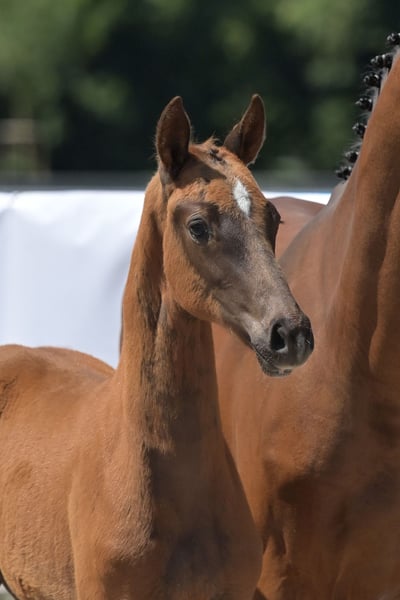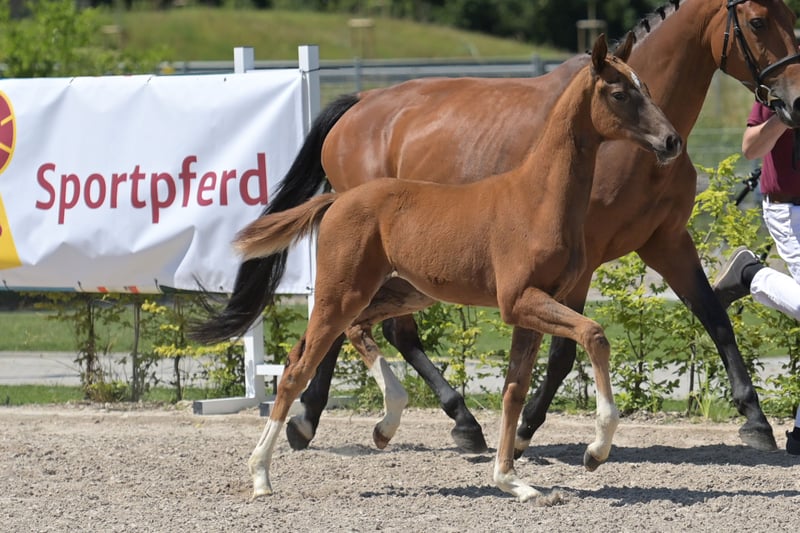 This beautiful and very correctly built dressage mare was born on March 23, 2025. She is an exceptional specimen - long-legged, elegant, chestnut, and with four white socks. She is an embryo transfer foal from the famous Vitalos. Her mother, Quality Time, is 10 years old this year and an Oldenburg elite mare - pedigree: Quantensprung/Placido. Quality Time has been successfully competing in dressage for years and has won all her tests in 2025 so far. M**, S*, and S** victories all with scores of 69-70%. She is currently nearly S*** ready and will make her debut at this level this season. Quality Time was also qualified for the Bundeschampionat as a 5-year-old. With this beautiful and talented filly, you are securing the future! The sale is directly from the breeder. The mother is also with us and can be viewed. !! The mare with which the foal is at foot is not the genetic mother but a surrogate mother. The ridden black mare in the videos/pictures is the genetic mother. Additionally, we are selling a full brother to this foal, born on March 10, 2025.